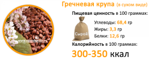 Якщо говорити про сирої гречаної крупі, то в 100 грамах міститься близько 330 кілокалорій. Саме це кількість часто використовується і вважається сприятливим для приготування страви. Повірте, це зовсім небагато, особливо якщо врахувати, що у добу доросла людина повинен вжити до 2500 кілокалорій.